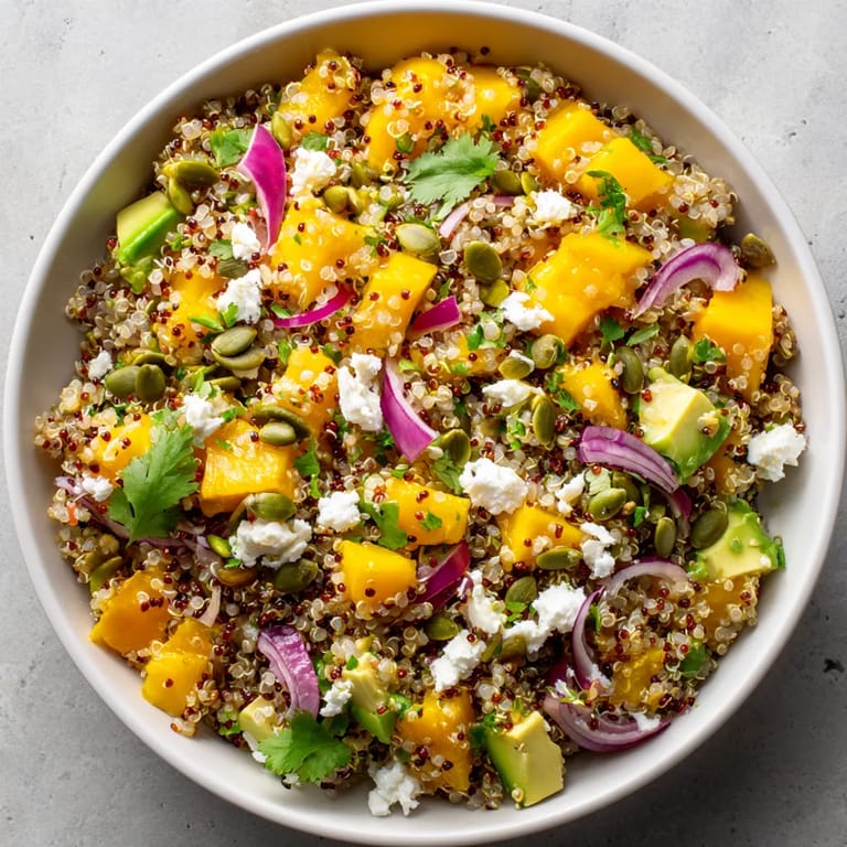 Guardar Esta ensalada de quinoa con mango, aguacate y queso fresco es una explosión de color y frescura para cualquier comida de verano. Es ligera pero saciante y combina sabores tropicales y cremosos con el toque especial de la quinoa y un aderezo de lima vibrante. Si buscas una opción que impresione sin complicaciones y sea perfecta para acompañar días calurosos, esta receta se convertirá en tu favorita.