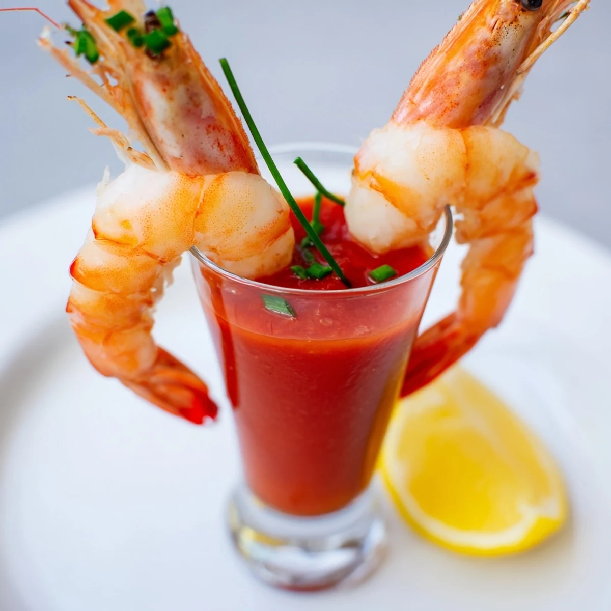 Se sirven en vasos tipo shooter, con dos gambas colgando del borde y una base opcional de hojas verdes para una apariencia distinguida.