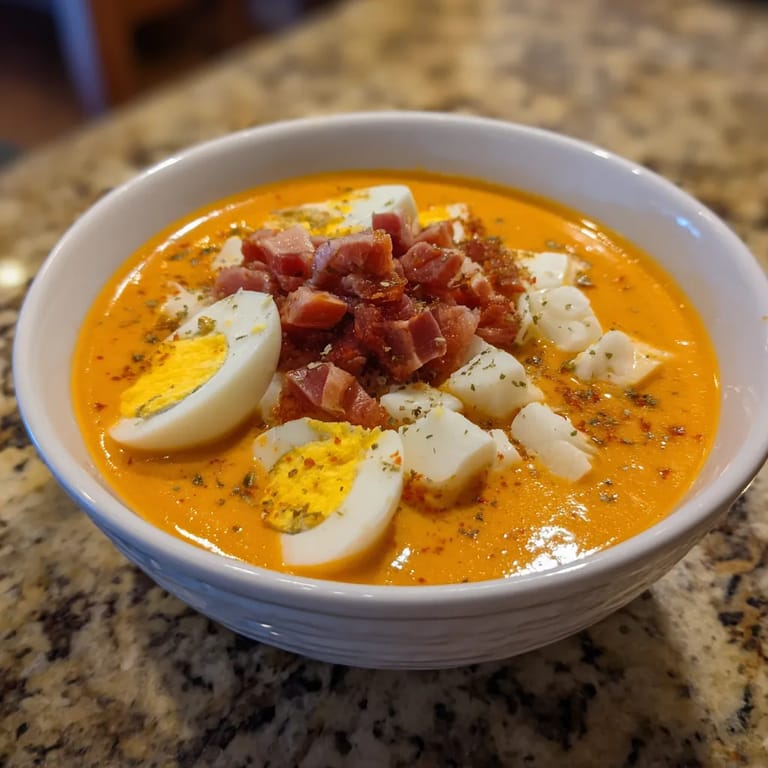 Guardar Este salmorejo cordobés es tan cremoso y refrescante que se convierte en la estrella de cualquier mesa veraniega desde la primera cucharada. Esa mezcla de tomate maduro con pan, rematado con huevo duro y jamón, me recuerda los almuerzos especiales de mi infancia en Andalucía. Es sabroso, fácil y te transporta a Córdoba con cada bocado.
