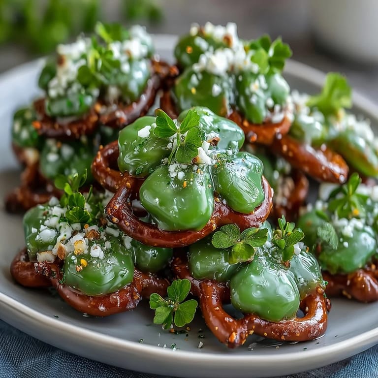 These shamrock pretzel bites shine as part of a festive St. Patrick's Day spread. Arrange them on a platter alongside other green treats like lime cookies, mint brownies, or pistachio fudge for a cohesive color theme. They're perfect for tucking into party favor bags, serving at school celebrations, or displaying as an edible centerpiece. Pair them with Irish coffee or mint hot chocolate for adults, or green milk for kids to complete the festive experience. For a fun presentation, arrange them on a bed of shredded coconut tinted green to resemble grass, or place them in clear cellophane bags tied with gold ribbon for gift-giving. They also work wonderfully as cake or cupcake toppers, adding a playful three-dimensional element to your St. Patrick's Day desserts.