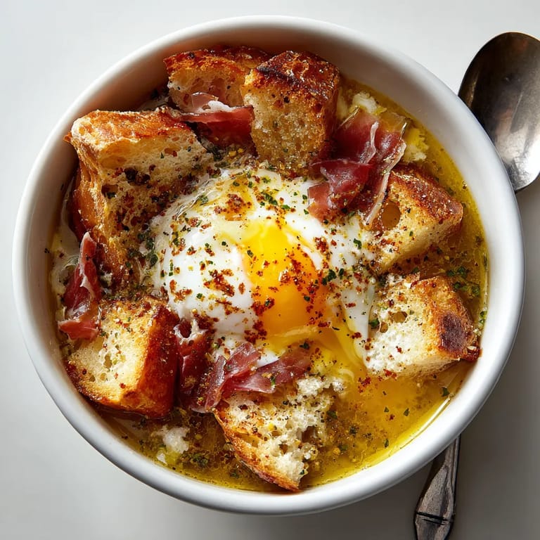 Guardar Esta sopa castellana rápida con huevo escalfado es la respuesta perfecta para esas noches en que buscas algo reconfortante y tradicional que no te haga pasar horas en la cocina. El aroma a pan tostado y ajo trae recuerdos de hogares cálidos y conversaciones familiares, y aún en su versión exprés, no pierde la esencia de la cocina española clásica.