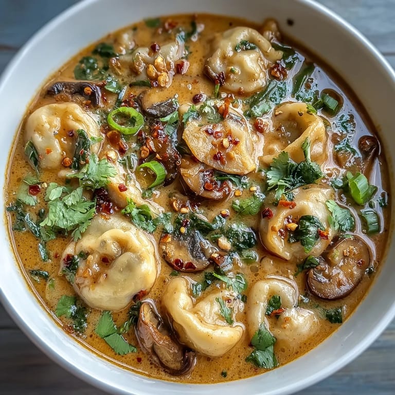 Guardar Una noche fría, mi amiga llegó a mi cocina con las manos vacías pero el apetito lleno, y me pidió algo que fuera rápido, reconfortante y que no requiriera pensar demasiado. Metí la mano en el congelador, encontré esas bolsas de dumplings veganos que siempre tengo a mano, y de repente todo comenzó a cobrar sentido: un caldo aromático con curry rojo, leche de coco sedosa, y esos pequeños tesoros flotando entre vapores de cilantro. Treinta y siete minutos después, ella levantó la cuchara con los ojos cerrados, y supe que había descubierto algo especial.
