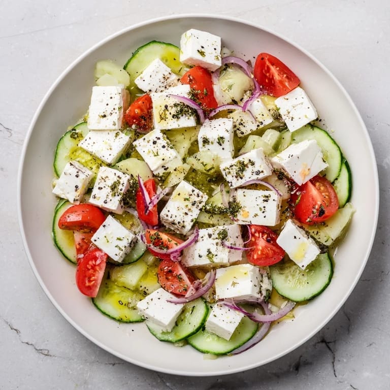 - Rocía ligeramente el feta y las verduras con aceite de oliva, espolvorea con sal marina gruesa y pimienta negra recién molida. Esto no solo sabe mejor, sino que hace que todo brille como si acabara de llover sol.