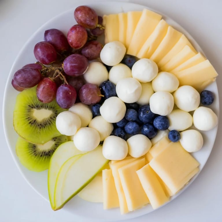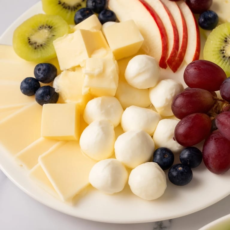 - Quesos: 100 g de queso cheddar en cubos, 100 g de bolitas de mozzarella (mini), 100 g de gouda en rodajas