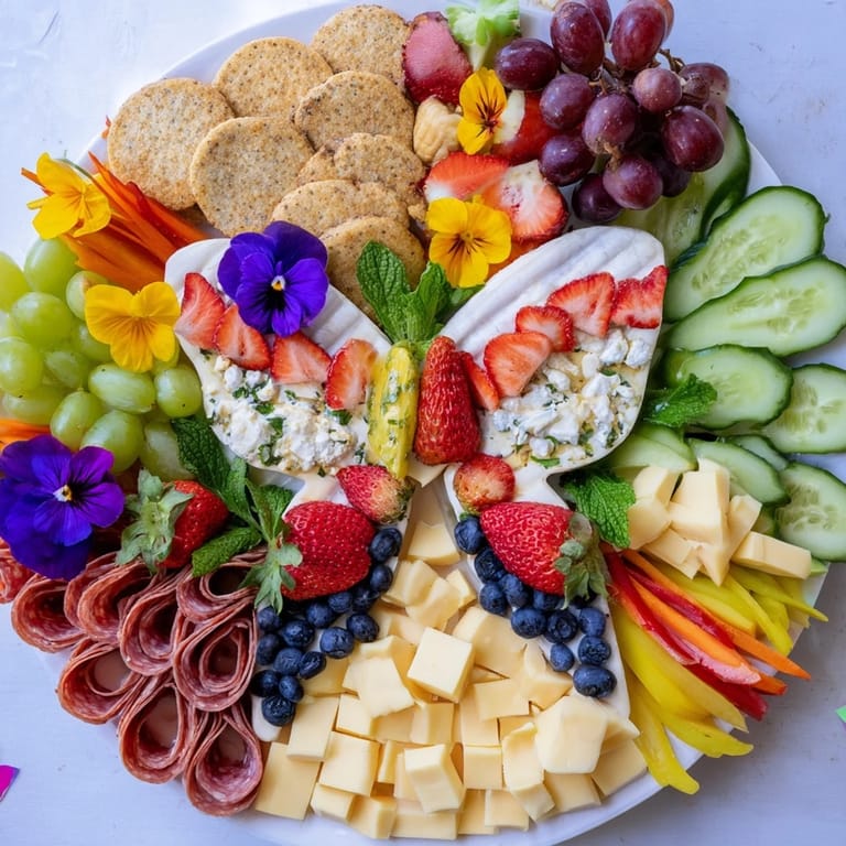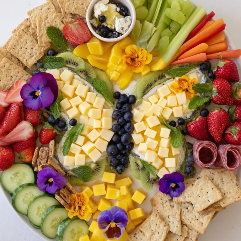 Guardar Una tabla vibrante y caprichosa inspirada en el verano, con frutas frescas, quesos, charcutería y flores comestibles arregladas artísticamente en forma de mariposa—perfecta para picnics y reuniones.