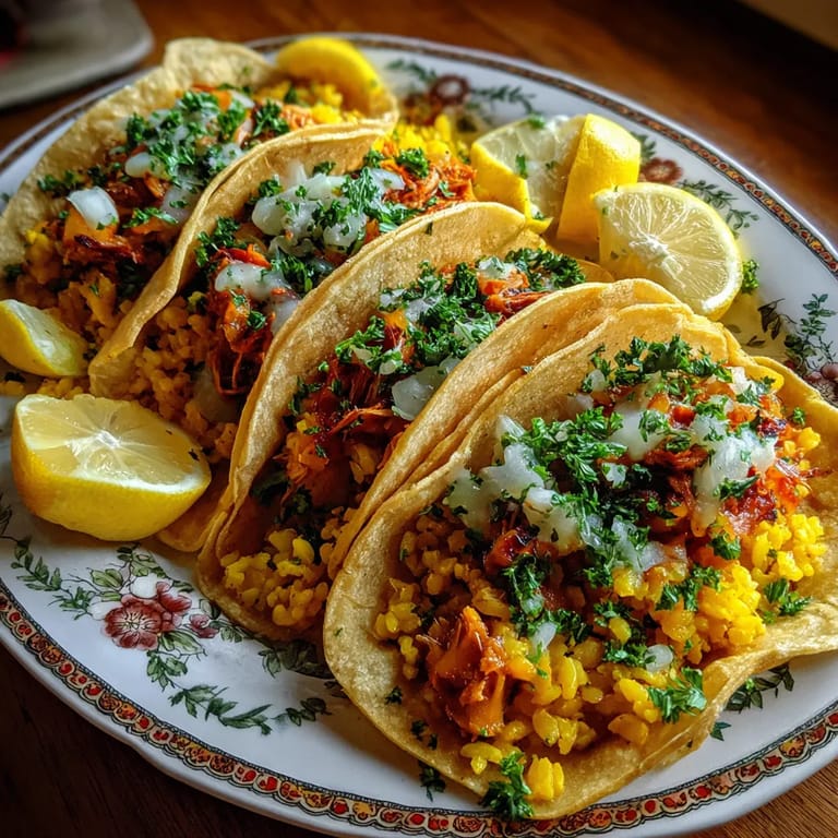 Guardar Estos tacos de paella con jackfruit son una manera divertida de combinar la esencia de la paella española con la frescura y lo versátil de los tacos mexicanos. Resultan ideales para sorprender a amigos en una cena especial o para reinventar una comida familiar con sabores intensos y una textura espectacular completamente vegetal.