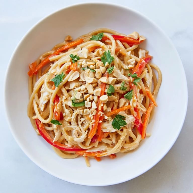 Guardar Una tarde de verano, mi amiga tailandesa me hizo esta ensalada de fideos con pollo mientras charlábamos en su cocina, y el aroma de la combinación de maní, lima y jengibre fue instantáneamente adictivo. Me enseñó que la clave no era la complejidad, sino el equilibrio de sabores frescos y atrevidos que funcionan juntos sin esfuerzo. Desde entonces, cada vez que preparo este plato me transporta a esa conversación despreocupada, y siempre termino haciendo una porción extra porque nadie puede resistirse a un segundo tazón.