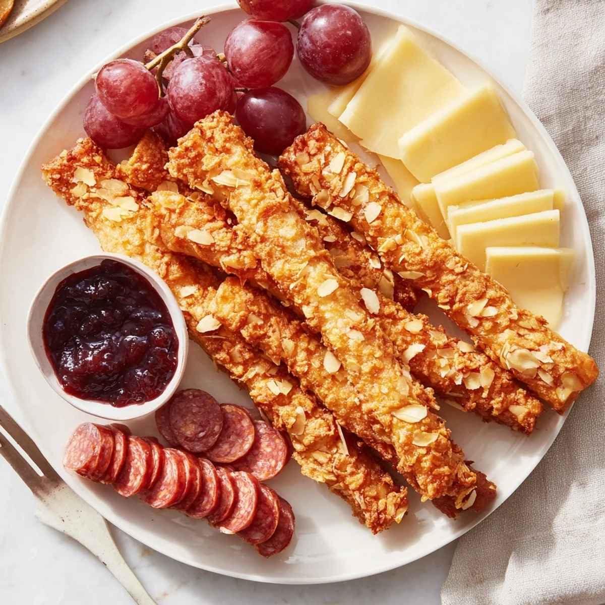 Guardar Los Almond Torrija Charcuterie Dippers son una fusión original de las clásicas torrijas españolas y la charcutería gourmet, con palitos de brioche crujientes cubiertos de almendra y acompañados de embutidos, quesos y frutas para un aperitivo único o un brunch especial.