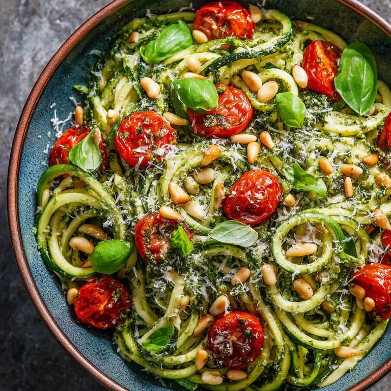 La combinación de noodles vegetales y pesto nace de la cocina italiana moderna que busca reinterpretar clásicos como los espaguetis al pesto en versiones saludables. En Italia, la albahaca fresca de verano es un tesoro y hacer pesto es motivo de reunión familiar. Esta receta celebra la tradición mediterránea de aprovechar lo mejor del huerto de una manera sencilla y refrescante.